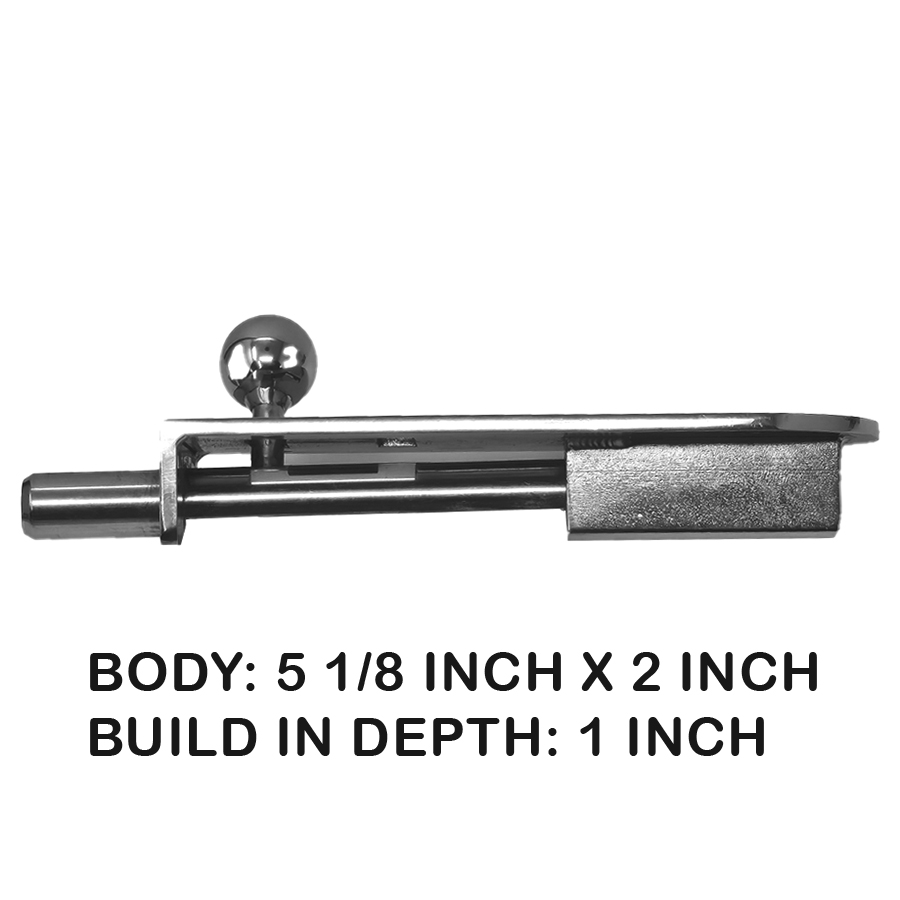 Flush Bulwark / Barrel Bolt. Right Hand. Size: 6 3/8” x 2” x 1”. Build in depth: 3/4”. 1/2” inch round bolt. Bolt Extending 1 1/8. 316 Mirror Polished Stainless Steel. Spring-loaded; Heavy duty.
